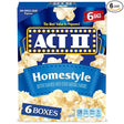 Contiene seis cajas de seis bolsas de 2,75 onzas de palomitas de maíz para microondas Act II Homestyle.